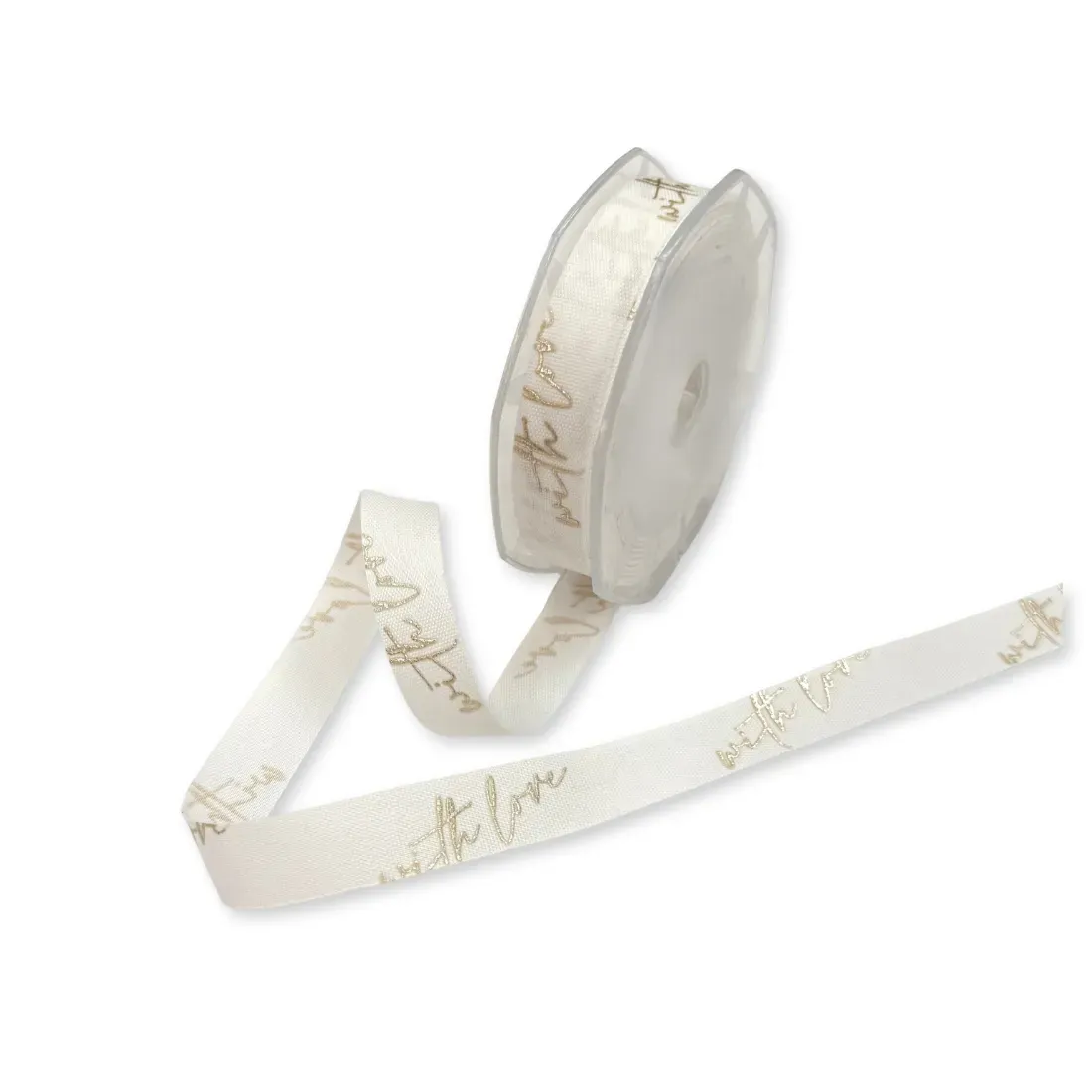Nastro in fettuccia con scritta dorata "With Love", pratico e veloce da utilizzare sarà un grande alleato per per abbellire ogni vostra creazione.