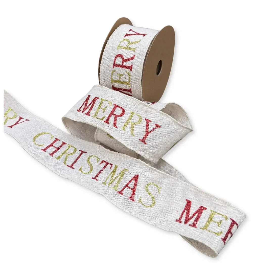 Nastro in tessuto decorato con scritta Merry Christmas ideale per abbellire ogni vostra creazione.