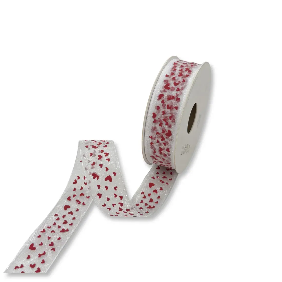 Nastro Lovly in voile bianco con piccoli cuoricini rossi, dal tocco delicato e dalla facile applicazione.