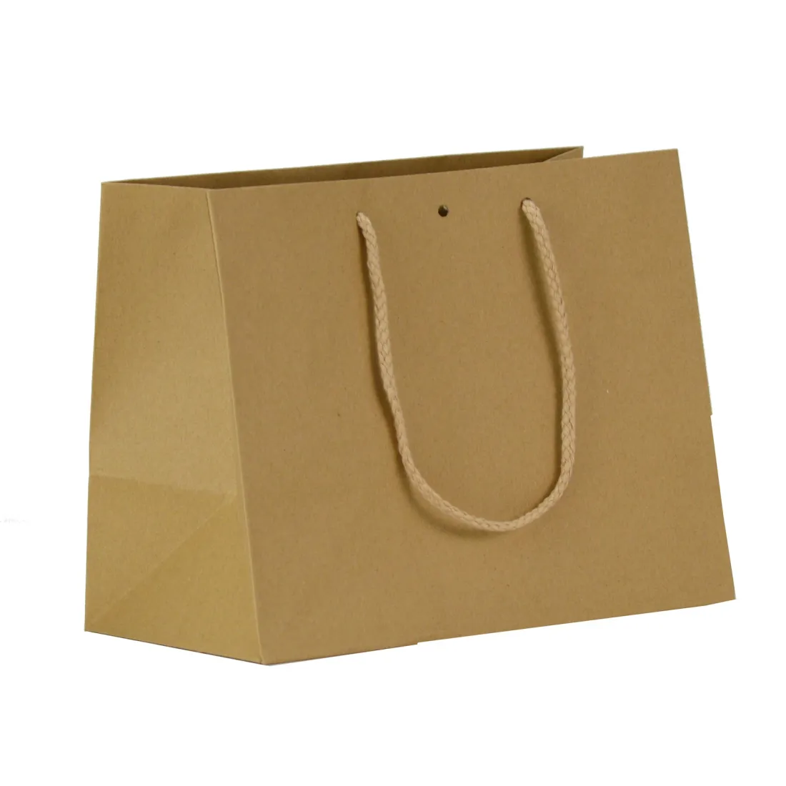 Shopper in carta avana con maniglia annodata e foro centrale.